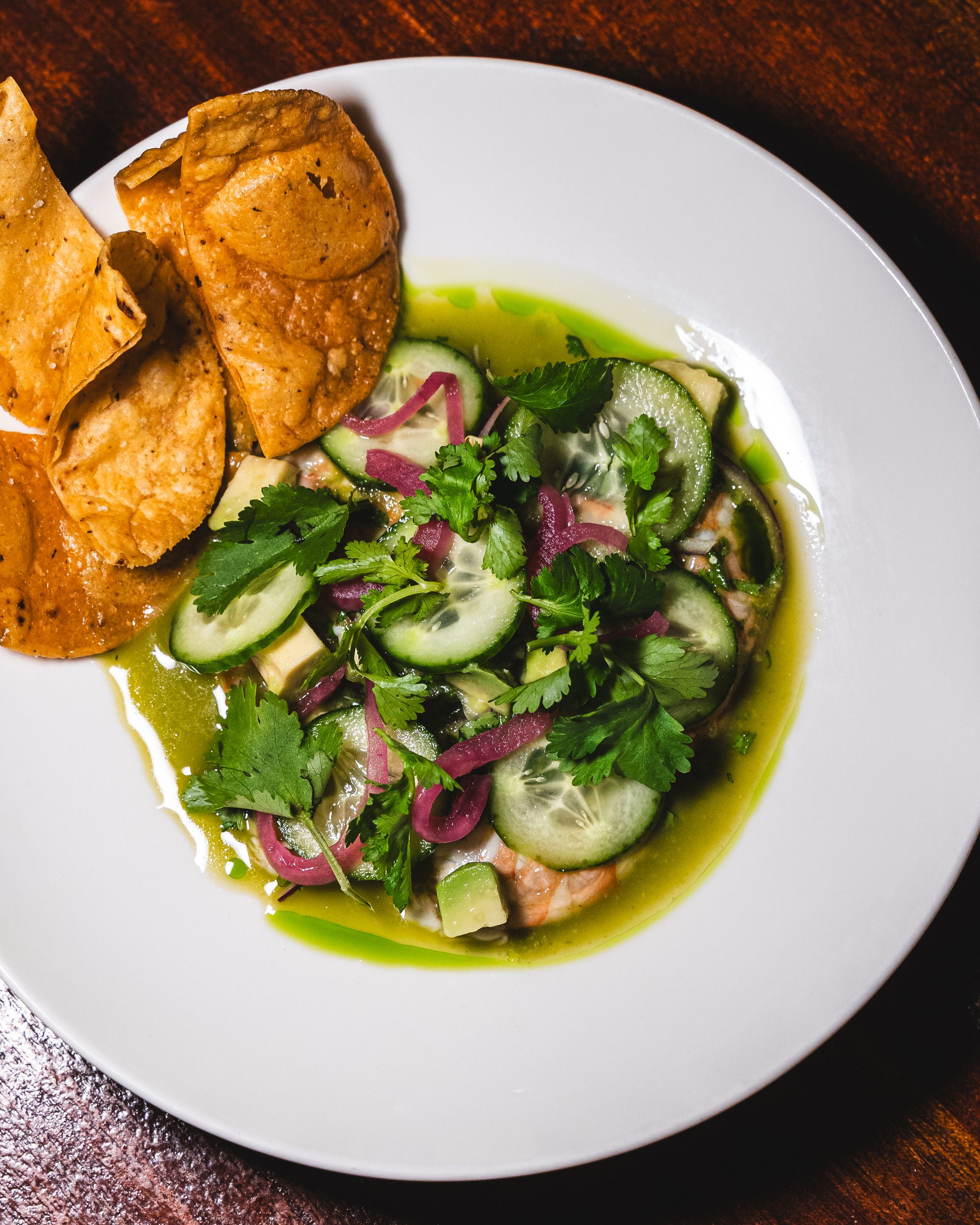 Aguachile de camaron prawn ceviche, red onion, cucumber, crisp tortillas $28